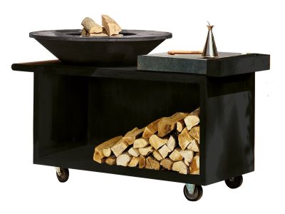 Dieses Modell ist aus schwarz beschichtetem Stahl gefertigt und mit einer dunkelgrauen Keramikarbeitsplatte ausgestattet. Keramik ist sehr witterungsbeständig, sodass Sie die Arbeitsfläche bedenkenlos im Freien stehen lassen können. Das Untergestell verfügt über Räder, einen Handgriff und bietet praktischen Stauraum für Ihr Brennholz. Zusätzlich sind ein praktischer Halter für Gewürze und ein OFYR Spatel im Lieferumfang enthalten.
