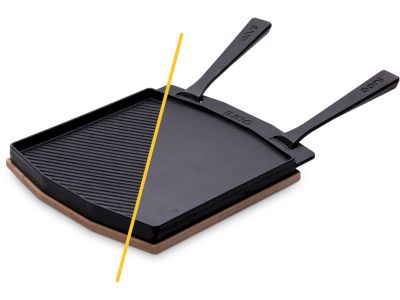 Die Grizzler wurde mit Blick auf Benutzerfreundlichkeit entworfen. Die gusseisernen Griffe sind einfach abnehmbar, wodurch die Platte kompakt wird und leicht in Ihren Ofen passt. Nach dem Garen können Sie die heiße Platte direkt auf das mitgelieferte Servierbrett aus Holz stellen. So servieren Sie Ihre Gerichte stilvoll auf dem Tisch, ohne die Oberfläche zu beschädigen.