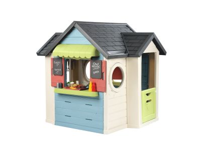 Das Herzstück dieses Spielhauses ist die eingebaute Sommerküche. Diese ist ausgestattet mit einem Kühlschrank, einem Backofen, einem Gasherd mit Flammen, die man 'aufflackern' lassen kann, einer Spüle und einer Kasse mit Kartenlesegerät. Um das Erlebnis komplett zu machen, wird ein Set mit mehr als 38 Zubehörteilen mitgeliefert. Dazu gehören Spielzeug-Lebensmittel wie Hamburger und Würstchen, Töpfe, Teller, Besteck und sogar kleine Kreidetafeln, um eine Speisekarte darauf zu schreiben.