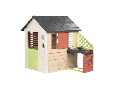 Dieses Smoby Nature Spielhaus mit angebauter Außenküche wurde entwickelt, um Kinder ab 2 Jahren zum Spielen im Freien zu animieren. Das Häuschen hat ein realistisches Design mit einer kleinen Tür, zwei Fenstern mit funktionsfähigen Fensterläden und einem Schiebefenster. So kann Ihr Kind seiner Fantasie freien Lauf lassen und sich die tollsten Abenteuer ausdenken.